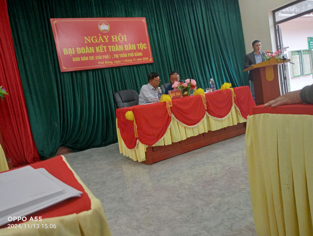 Phát biểu tại ngày hội, Phó bí thư Thường trực Đảng Uỷ Đặng Tuấn Cường đã biểu dương những đóng góp tích cực của Nhân dân và cán bộ Khu Phố I trong năm qua. Đồng chí Đặng Tuấn Cường đề nghị chính quyền, UBMTTQVN thị trấn Phố Bảng và Khu Phố I tiếp tục tuyên truyền, vận động Nhân dân thực hiện tốt chủ trương của Đảng, chính sách, pháp luật của Nhà nước; tích cực tham gia các phong trào thi đua yêu nước, cuộc vận động; tham gia xây dựng Đảng, xây dựng chính quyền. MTTQ, các tổ chức chính trị - xã hội tiếp tục thực hiện tốt vai trò “cầu nối” giữa Đảng, chính quyền và Nhân dân. Đồng thời, quan tâm chăm lo các hộ gia đình chính sách, hộ có hoàn cảnh khó khăn; chung sức, đồng lòng hoàn thành tốt nhiệm vụ chính trị, phát triển kinh tế - xã hội địa phương.