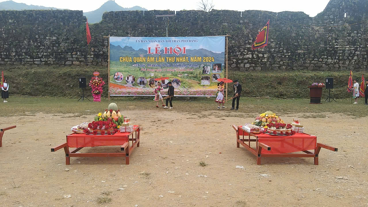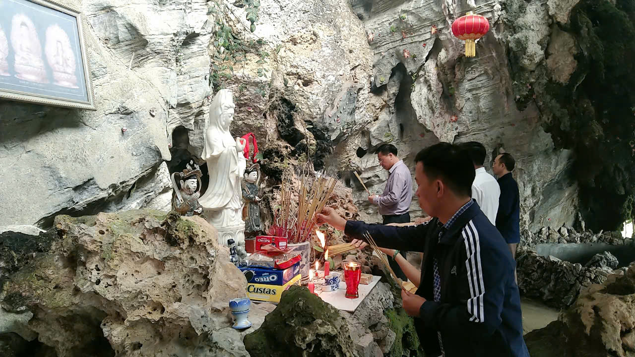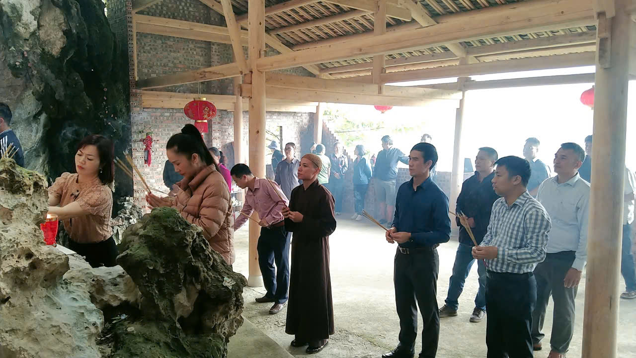 Cán bộ và nhân dân thị trấn dâng lễ cúng Chùa Quan Âm tại thôn Xóm Mới và Miếu Thổ Địa khu hang Động Nguyệt.